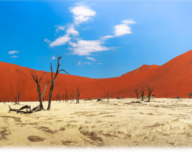 Pensione completa. La sveglia oggi è prevista alle prime luci del giorno. Si entra infatti all’interno del Parco del Namib Naukluft proprio al sorgere del sole. I primi 50 Km sono su strada asfaltata e da molti questo tragitto è considerato il più stupefacente di tutto il paese. Cordoni di dune, infatti, lambiscono la strada e man mano che il sole si alza, le dune assumono da un lato tutte le colorazioni possibili del rosso mentre l’altro lato rimane in penombra. Un gioco di colori che da sempre affascina i visitatori. Ci sarà del tempo a disposizione anche per esplorare Dead Vlei, uno degli angoli più belli in assoluto del Namib e non mancherà una visita al vicino Canyon di Sesriem. Rientro al lodge per il pranzo. Pomeriggio a disposizione per relax ai bordi piscina o per attività facoltative. Cena e pernottamento. Sossusvlei Questa valle dove il fiume Tsauchab scompare tra l’argilla bianca alla base di alcune tra le dune più alte del mondo, è una delle attrazioni turistiche più spettacolari della Namibia. Le dune si stendono a perdita d’occhio e le loro ricche colorazioni variano dall’albicocca al rosso e all’arancio vivo. Tre dei punti più belli nella zona di Sossusvlei sono: Hidden Vlei, a breve distanza dal parcheggio 2×4, Deadvlei, così nominata a causa degli scheletrici tronchi di antiche acacie che si trovano al centro della secca piana e Sossusvlei stessa. Se le piogge sono abbondanti, il fiume Tsauchab riesce a scorrere fino alla valle creando un paradiso per gli uccelli acquatici. Anche durante la stagione secca spesso è possibile vedere orici, antilopi saltanti e struzzi che si nutrono della sparsa vegetazione lungo i corsi d’acqua. Il Nara!, un frutto simile allo Tsamma, melone che si trova in questa zona, viene mangiato per il suo contenuto d’elementi nutritivi e di liquido. Le Dune Del Namib Le dune del Namib si estendono a sud, dall’Orange al Kuiseb River, (nella zona nota come dune sea o “mare di dune”) e a nord, da Torra Bay nel parco della Skeleton Coast fino al fiume Cuoca in Angola. Sono composte da variopinte sabbie di quarzo ed hanno sfumature che vanno dal color crema all’arancio, al rosso e al viola. A differenza delle antiche dune del Kalahari, quelle del Namib sono dinamiche perché si spostano e assumono forme particolari per effetto del vento. La parte superiore della duna, rivolta in direzione dello spostamento, si chiama pendio di scorrimento ed è qui che la sabbia, cadendo dalla cresta, scivola verso il basso. In questo punto si accumulano le particelle vegetali e i detriti animali che costituiscono la magra fonte alimentare degli abitanti di quest’ambiente e proprio per questo motivo vi si concentrano quasi tutte le forme di vita esistenti sulle dune. Sesriem Canyon Molti anni fa il fiume Tsauchab, che sorge nelle montagne Naukluft e Zaris intagliò un canyon in questa zona apparentemente desolata. Il Sesriem Canyon in realtà ospita uccelli, animali e piante perché le sue ripide pareti impediscono l’evaporazione dell’acqua e proiettano fresche ombre sul canyon. Oggi il fiume Tsauchab scorre solo dopo abbondanti piogge. Pare che il nome “Sesriem” derivi dal fatto che i primi visitatori dell’area raccogliessero l’acqua dal fiume unendo sei cinghie per i buoi (“riems” in Afrikaans) per fare in modo che un secchio raggiungesse l’acqua dalla cima del canyon. La parte ovest di questo canyon profondo 30 metri diventa gradualmente più bassa e a un certo punto il fiume si espande e forma una valle lungo il suo corso per Sossusvlei.